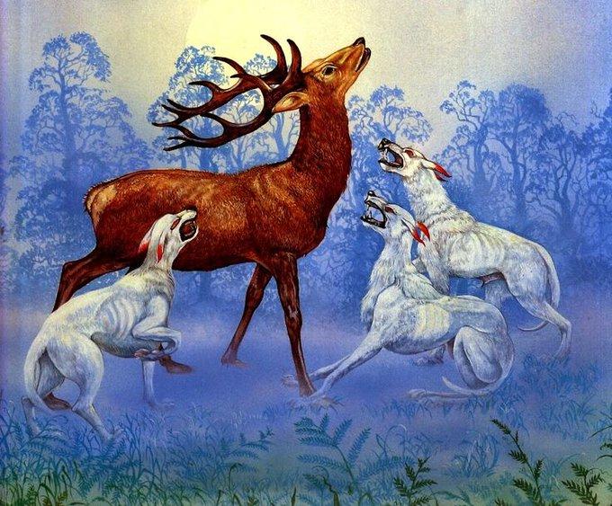 In Welsh folklore, the Cwn Annwn ("Hounds of the Otherworld") are white fairy dogs with red ears and red eyes that race across the sky as the Wild Hunt. Their baying can be mistaken for the honking of geese, though it actually gets quieter the closer the Cwn Annwn get to their prey. 🎨 Roger Garland