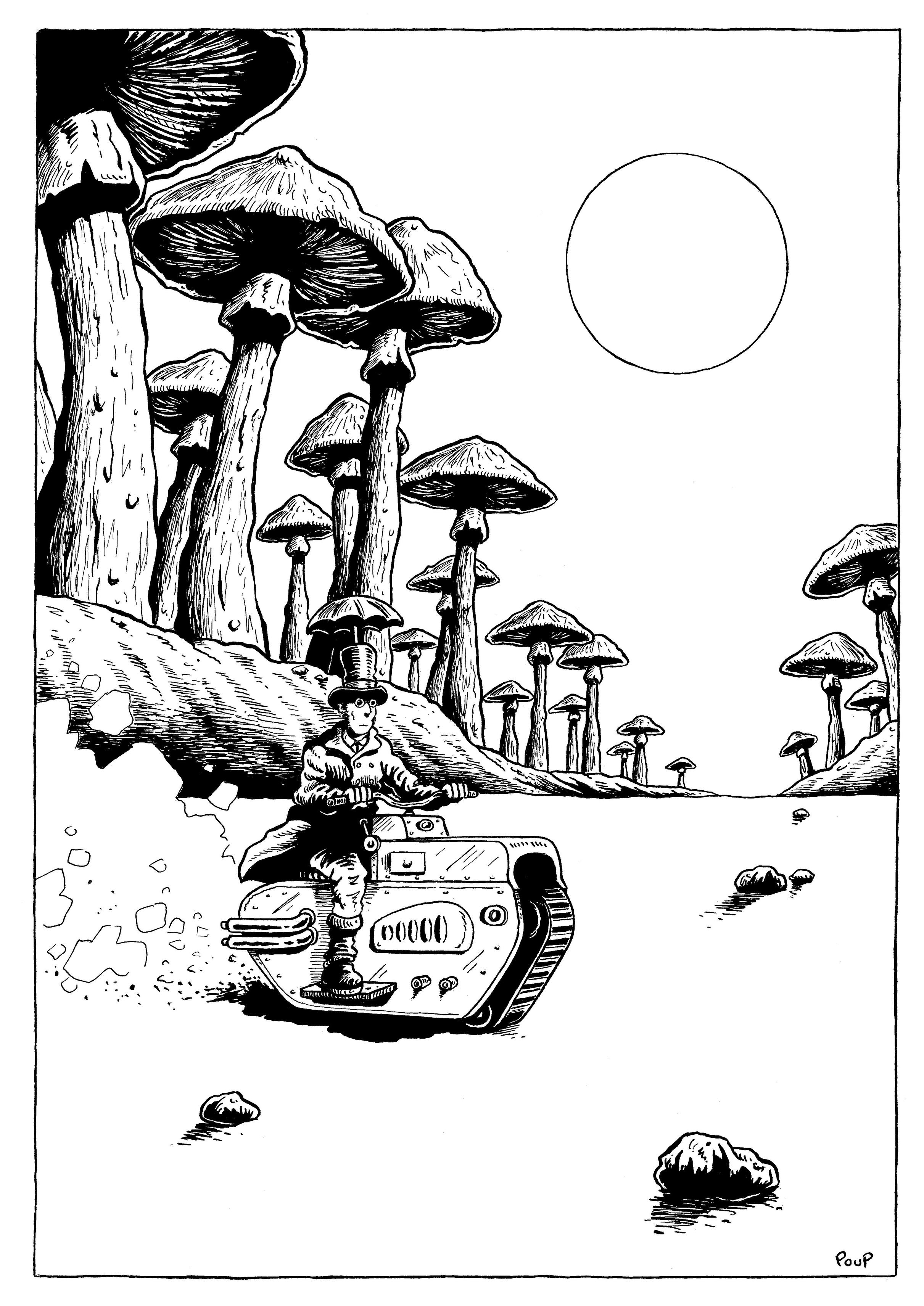 Morning Ride In Hallucinogenic Valley #illustration #dessin #drawing #BlackAndWhite #NoirEtBlanc #encredechine #indianink #steampunk #mushroom #mushrooms #desert #steampunkbiker #steampunkbike